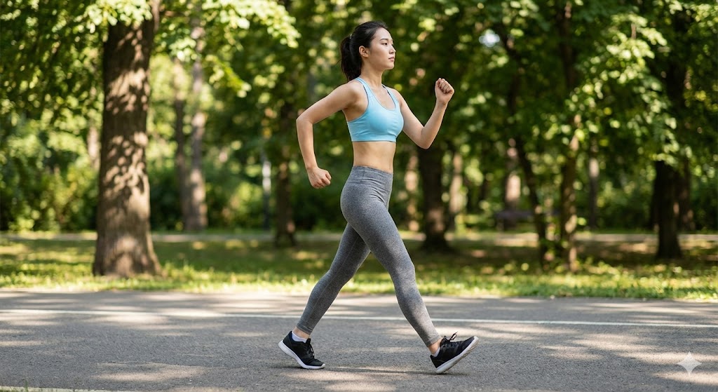 - 상체: 가슴을 펴고 배에 힘을 줍니다(코어 긴장). 팔은 'L'자로 굽혀 앞뒤로 힘차게 흔듭니다.