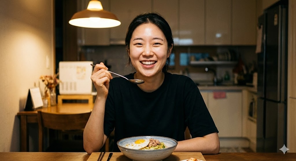 [이미지 4: 식탁 앞에 앉아 숟가락을 들고 행복한 표정으로 식사를 시작하려는 모습]